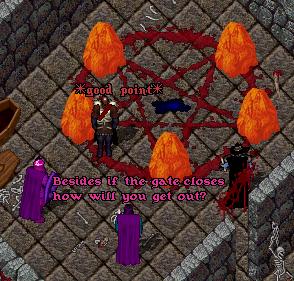"As if I would have believed you," he responded dryly. I exhaled, knowing full well it was true. What a mess. While we were discussing such things, Soth mentioned that the Black Gate had been opened again, not long ago. We knew the Guardian could open the Gate now from his side, but what we hadn't known was that Soth was not only capable of opening the Gate, but he could also break the circle of golden rocks as well--thus preventing the Black Gate from being opened. We went back and forth over whether we should even do so--Soth couldn't be sure that he could reopen the Black Gate again later once the circle was broken, since most of the circle had already been in place before he'd even been summoned, so he hadn't seen the beginning of the spell. And we would need to open the Gate again, once we were ready to save Lord British and the others. The chance that we might close forever our only doorway into the realm where our friends were trapped grated on me. Yet there seemed to be a greater risk leaving the rocks in place, as the Guardian might come through at any time. Finally it was decided to break the spell and remove the rocks. We would all take one, we agreed; Soth wanted to hold a rock for himself so that we couldn't double-cross him, and of course we wanted at least one of the stones so that he could not double-cross us. It made logical sense. We agreed to meet at the Yew Crypts. Soth sent Navien to fetch some necromancy reagents to use, so I guess that's why only Soth could perform the spell--it was necromancy, not normal Britannian magic. Soth and I arrived at the crypts first, and I stood staring at the rippling energy marking the closed Black Gate while Soth prepared the spells he would use to break the circle. He paused consideringly at one point. "I need fresh blood," he spoke up suddenly, and before I could absorb those words, he had scored a deep gash across my arm with a dagger.