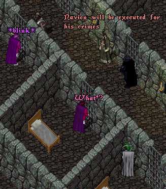 [9/1/2003] We had offered to take Sami to Cove to see the Shadow Keeper, so today was the day we had scheduled. We met at the Lycaeum as usual. Sami was cute, she'd packed bread and cheese, a walking stick, and even a leather cap. ![]() Of course, it wasn't a long journey, since I'd brought a rune marked for Cove. But I had marked it a bit of a distance from the Shadow Keeper, so we did have a short way through the town to walk. Sami enjoyed looking at the mountains and other things that she doesn't get to see often, since she rarely leaves the Lycaeum. At the house of the Shadow Keeper, up on the cliff, Sami bulked outside the doorway for a few moments, nervous. Andrella and I coaxed her inside and up to the Shadow Keeper. He looks like a wraith, so I don't blame her for being nervous. The Keeper remained still and mostly silent, gazing off as if into nothing. Sami finally gathered the courage to speak to him, although he didn't appear to be listening until she asked about the shadow quest. At that point, he suddenly looked at her and gave her the first Wand of Shadows, telling her to return all seven for her ethereal mount. It was the same basic thing he'd said to me, and probably everyone who had come for the quest. Sami looked astonished, then thanked him and we left. So she now has a wand of her own. Andrella and I privately discussed trying to gather the rest for her to get her an ethereal mount. It would take some doing though, and unfortunately with everything else going on, I'm not sure we will get the chance for quite a while. But if we can, we will. Also, Sami has given me a gem of entrapment from her father. She's asked me to trap a Shadow Guardian for her if possible, also for her thesis. We're a little bit worried that the guardian might be freed accidentally and wreck havoc on the Lycaeum. I don't know enough about the gems to know whether things trapped within can be freed at all, on accident or otherwise. I have a gem of entrapment, but I haven't tried using it yet--I haven't settled on what to use it on. So I decided I would take both gems with me. I'd trap the Shadow Guardian in one, then try to free it. If successful, at least we would know how it works. Then I'd trap it again using the other gem if necessary (I'm not sure if the gems can be reused). Andrella suggested the lava guardian, as that seems to be the easiest to get to. Perhaps when we have a few people, we will give it a try. Although there are still two shrines to do, and I don't know yet how we will get the runes... [9/7/2003] Andrella and I got together tonight with some free time on our hands. We debated for a moment trying to do Hythloth or the Abyss with just the two of us, but finally discarded the idea. I don't know for sure what those dungeons are like now, but chances are I still would not want to enter one with only two people. So instead we decided to try to get that Shadow Guardian for Sami. We went to Deceit first, where the volcanic guardian patrols. We had agreed to get the wand from it for Sami, so that would mean defeating it once first. I took out my Water sword and decided to try to melee it. "Hit and run only though," Andrella warned me. "He hits hard." We went in together, riding our ethereal mounts and slashing at the Shadow Guardian while always on the move. I wasn't quite fast enough, though, because it managed to get its massive red arm down across the back of my neck. I saw stars and fell comatose to the ground. "Okay, so that didn't work," I chuckled when Andrella got me back on my feet and we'd retreated briefly to regroup. This time, she went in with her ancient katana while I fired from a distance with my bow. Every time the lava guardian tried to approach me, I would run around it and keep firing. Andrella knocked off chunks from the magical beast with her katana, and relatively quickly it went down for the count. I quickly picked up the Wand of Shadows and tucked it away so that it would be safe. Then I noticed that the Shadow Guardian had been carrying a red pouch, so I grabbed that as well. Andrella and I retreated to a safe corner where I pulled open the pouch curiously...and blinked in stunned surprise. "What is it?" Andrella asked me. "It's a cloak of invisibility," I laughed, almost falling off my ethereal mount. "And it's not tuity-fruity." I giggled uncontrollably at the sheer irony. We waited a little while for the volcanic guardian to return (they are magical entities that regenerate, probably designed that way by the Shadow Keeper for the quest). But it was taking too long, so we went back to the Shadow Keep to peruse the other Shadow Guardians. "Did you want this cloak?" I asked Andrella in passing. After all, I already have one, although it is getting low in charges, so I have been saving it for critical times. "No way, I'm not spy," Andrella snickered. "I never was either. You need to broaden your horizons," I teased her. I stashed the wand and the new cloak into my bank box where they would be safe. Then we went to the runebook with the Shadow Guardian locations marked. Andrella and I spent a little bit of time discussing our options, wondering which one would be the easiest to reach. The difficulty of the guardian didn't matter for this, since our aim now was to trap one rather than defeat it. However, the guardians are all surrounded by other monsters, so the challenge is in reaching them. Finally we picked the Ice Fiend guardian. I exchanged my Water sword for my new Fire one, and we headed out. There were Ice-based daemons wandering around of multiple types, so finally I ran on ahead and hid in a niche in the wall, watching and waiting while Andrella provided a bit of distraction for the fiends behind me. We knew basically where the Shadow Guardian tended to haunt. I just needed to get it in my sights... Finally it came around a corner. It was massive. But I didn't hesitate. I snatched up the gem and spoke the spell that I had seen Cloud use against Lilith